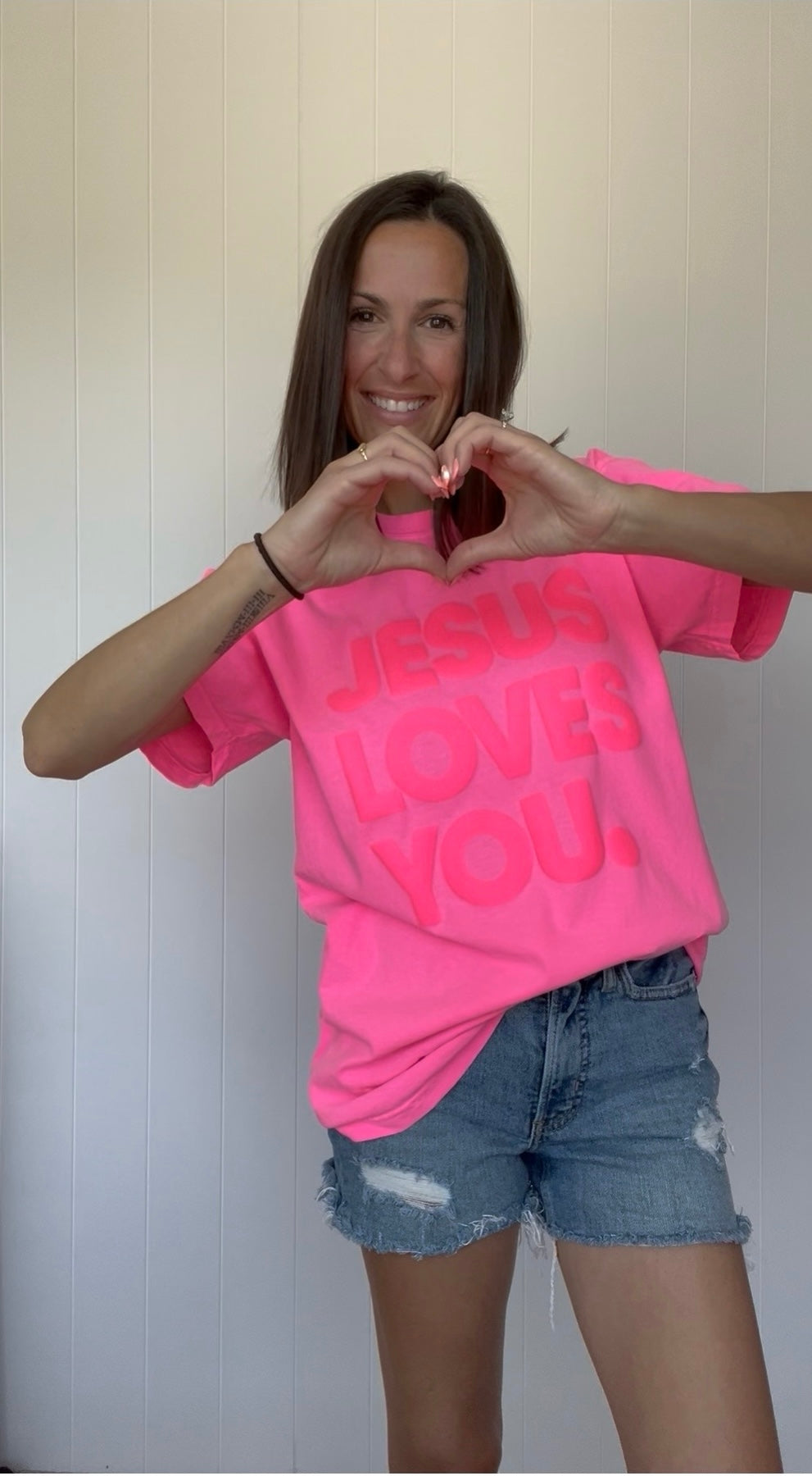Jesus Loves You (puff lettering) Hot Pink - Tee